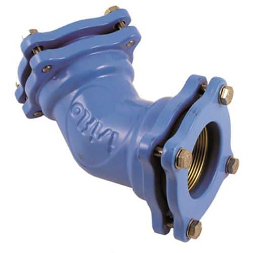 Isiflo 123 vinkelkoppling 45°, klämring x klämring för PE och Pem,PEH rör i blå epoxybelagd segjärn.